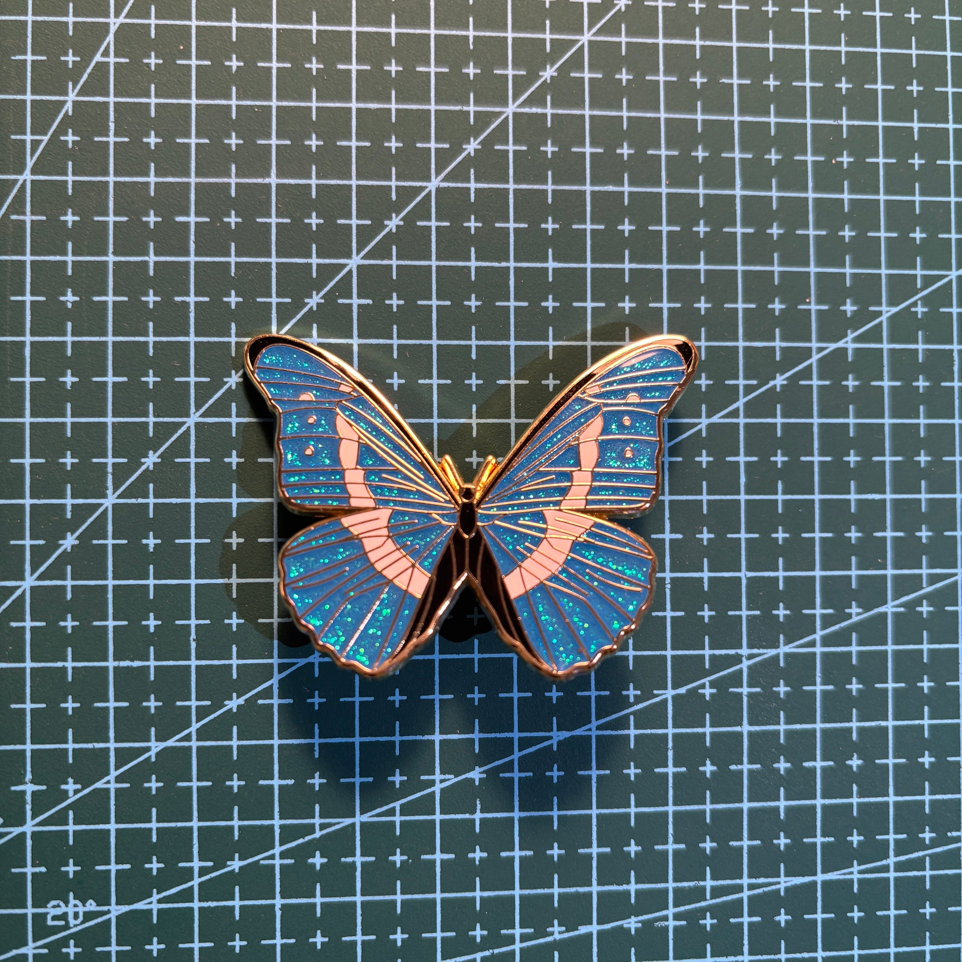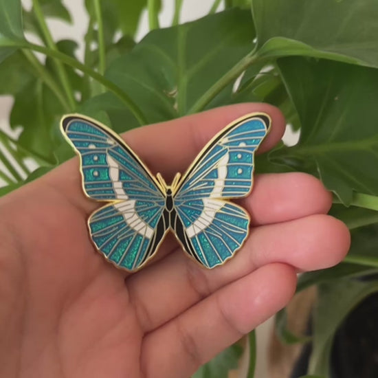 Add a touch of sparkle to your collection with this elegant Blue Glitter Butterfly Enamel Pin.