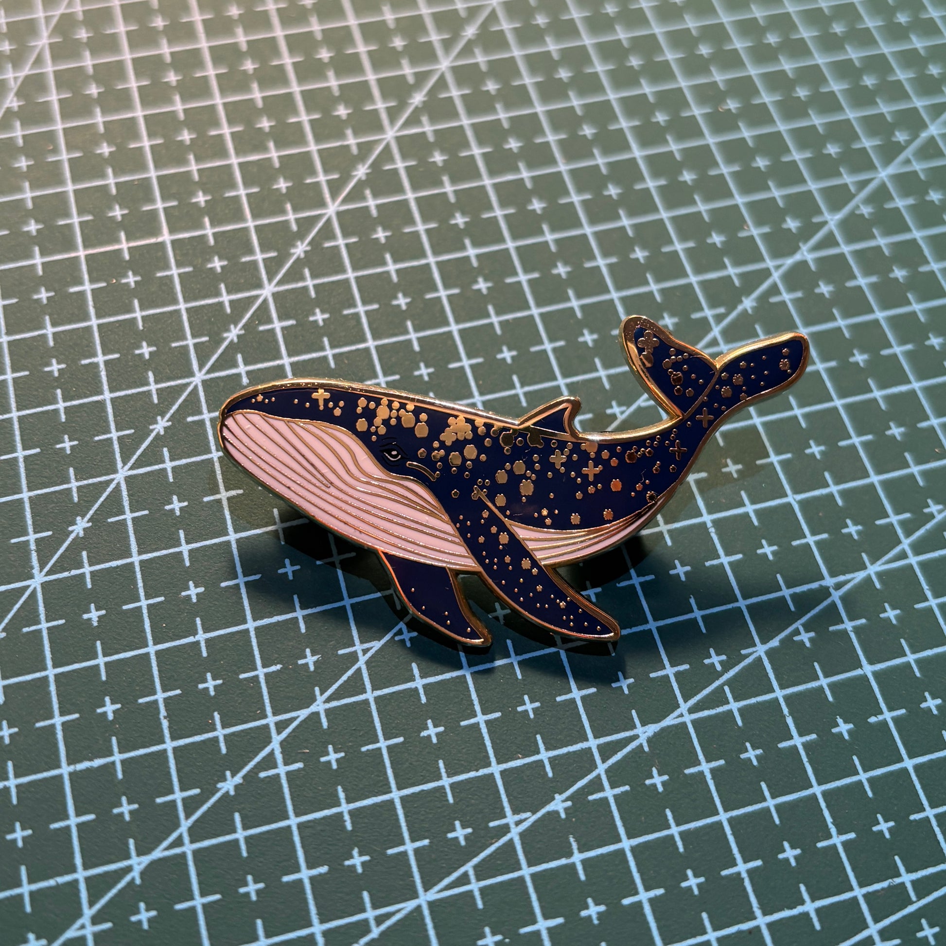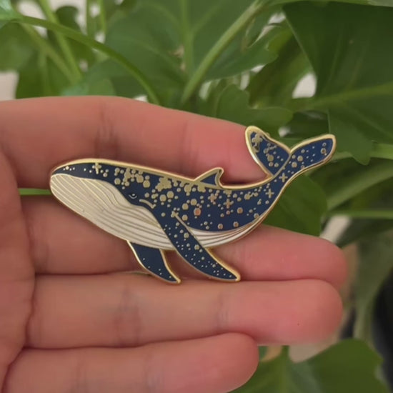 Crafted in shimmering deep navy blue with golden speckles and white enamel details, this pin captures the beauty of a whale gliding through a starlit sea.