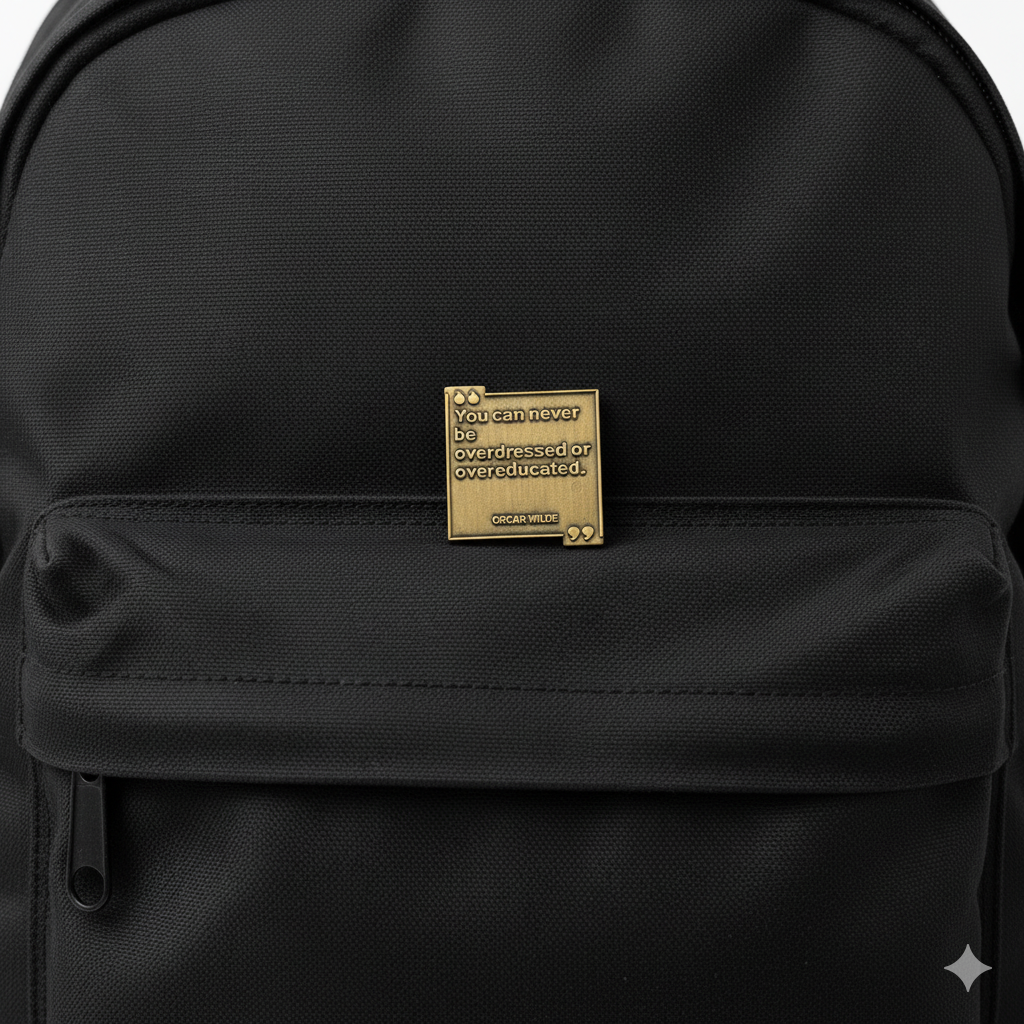 Carry timeless wisdom with this Oscar Wilde quote enamel pin. Featuring the iconic words “You can never be overdressed or overeducated,” embossed in a vintage brass finish, this square pin is a perfect accessory for anyone who loves literature, fashion, and wit.